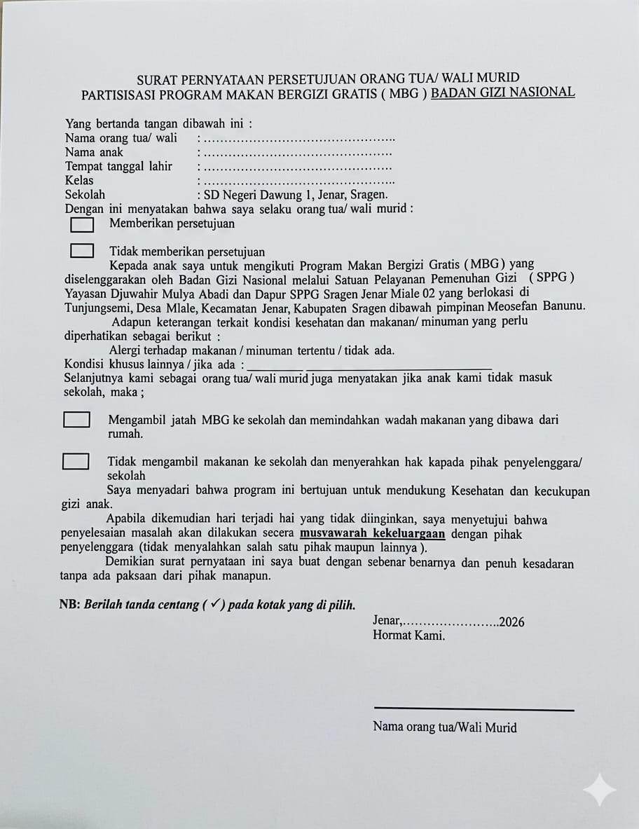 Sebuah dokumen surat persetujuan orang tua terkait program Makan Bergizi Gratis (MBG) di SD Negeri Dawung 1, Kecamatan Jenar, Kabupaten Sragen, Jawa Tengah, memicu polemik setelah beredar luas di media sosial Sabtu (25/4/2026).