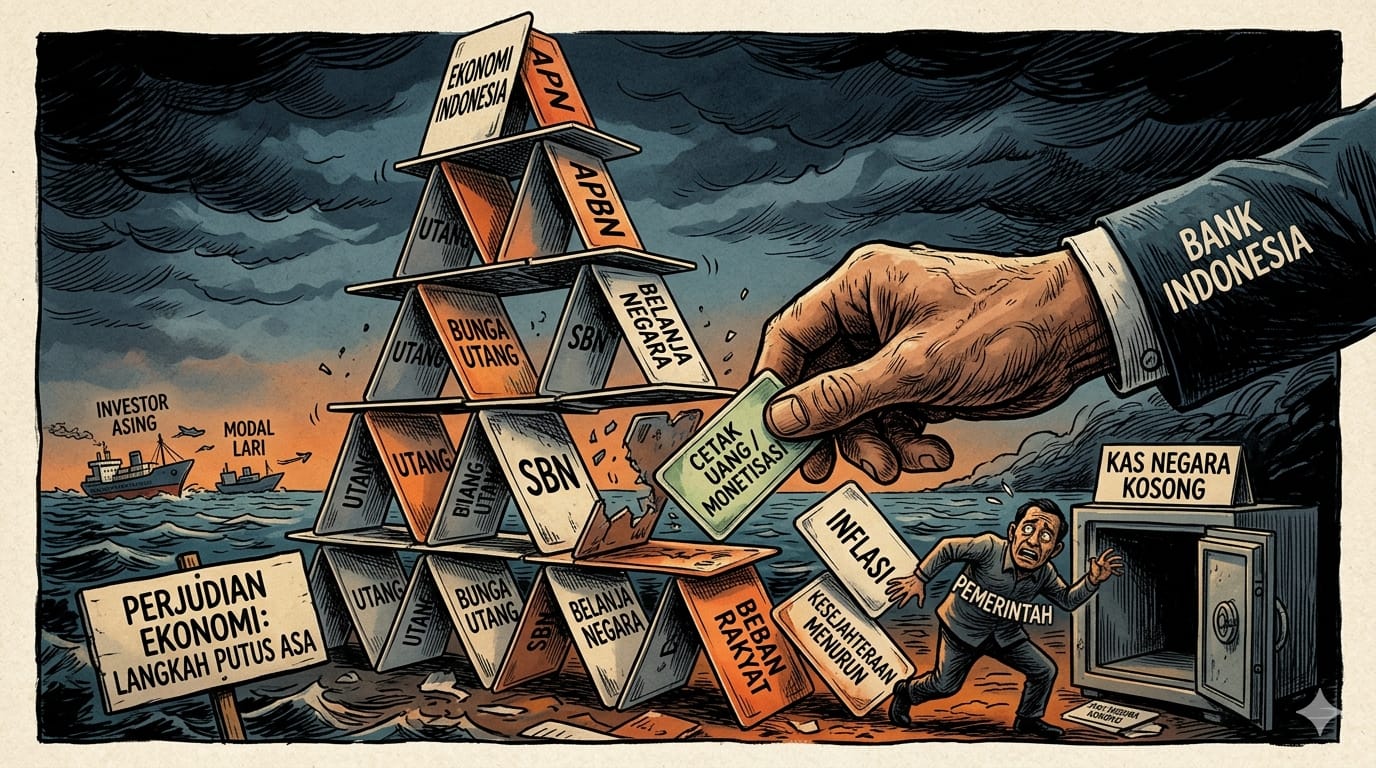 Secara sederhana, apa yang terjadi saat ini bisa diibaratkan seperti sebuah keluarga yang sudah kehabisan uang tabungan, namun tetap harus membiayai gaya hidup mewah. Ketika investor atau pihak luar tidak lagi mau meminjamkan uang karena takut tidak bisa dibayar, pemerintah menoleh ke Bank Sentral sebagai “penyelamat terakhir.”